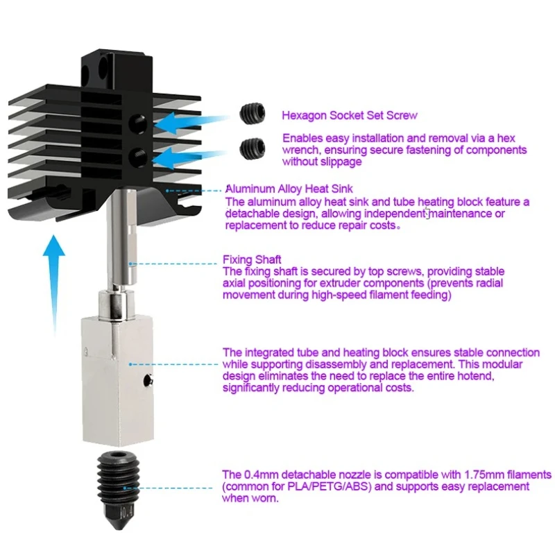 The nozzle features a detachable design, allowing individual replacement after wear without needing to replace the entire hotend. Core components like the heat sink and heating block support independent disassembly and maintenance, significantly reducing long-term operational and repair costs.