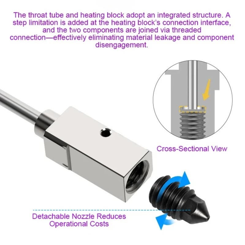 The throat tube and heating block feature an integrated one-piece design, with added step limitation and threaded connection at the joint. This dual-seal structure completely eliminates material leakage and component detachment issues common in traditional hotends. With an inner wall roughness of Ra 0.4 and ultra-thin 0.25mm wall thickness, the throat tube reduces filament feeding resistance and residue buildup, minimizing clogging risks.