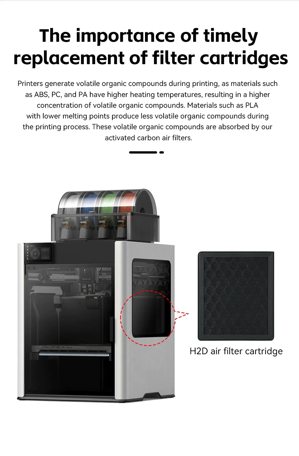 When printing filament such as ABS, PETG, PA with high VOC and particulate emissions, the cartridge can be used for about 2 months.