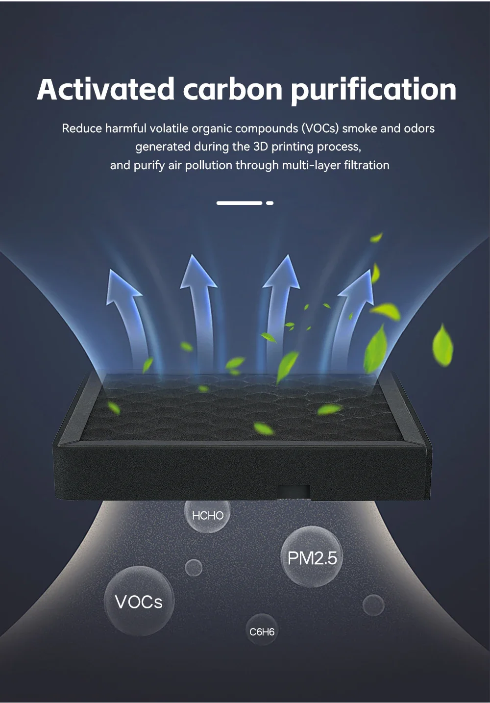 It efficiently captures 99.95% of nanoparticles, formaldehyde, harmful VOCs, and odors, ensuring cleaner printing operations.